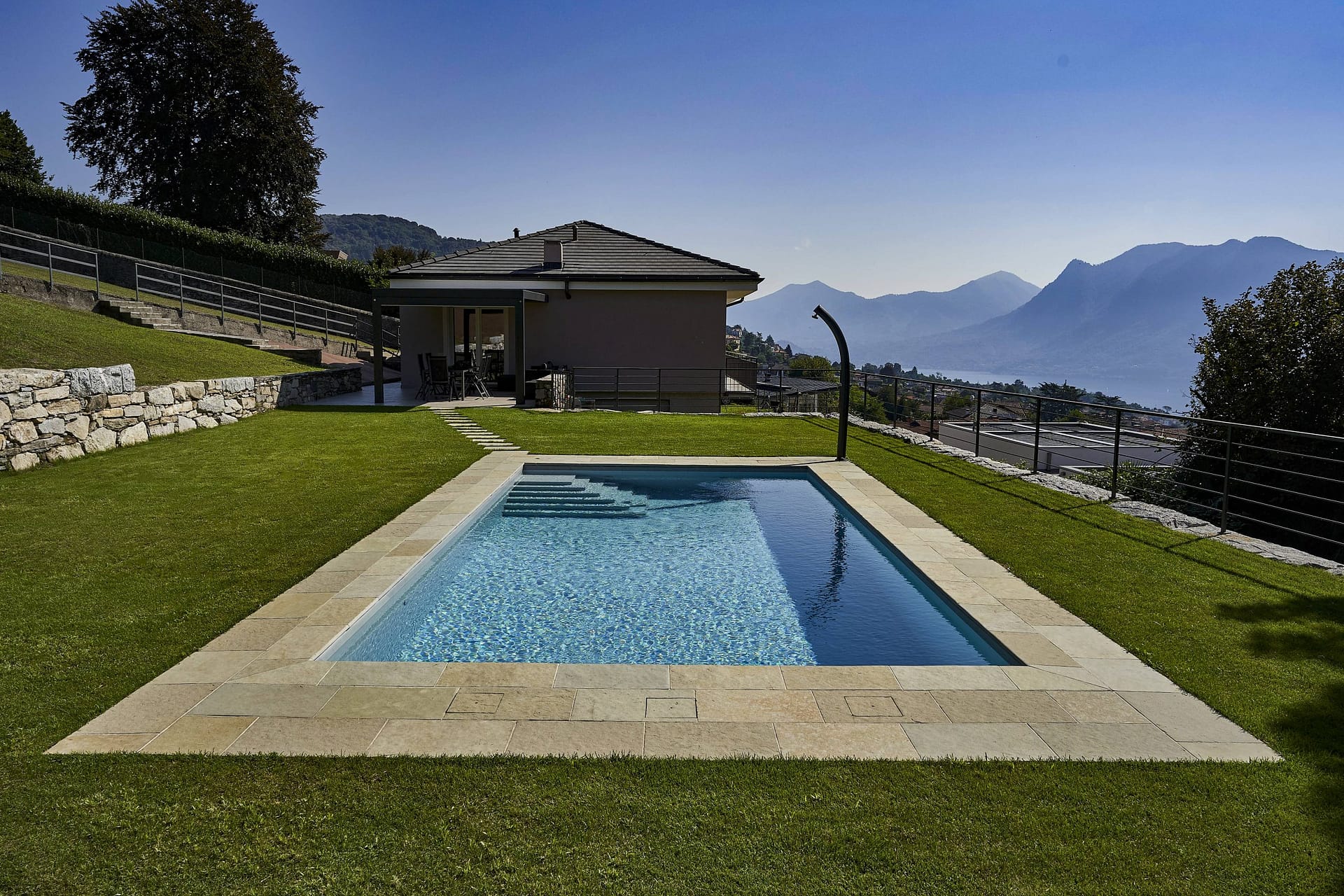 La realizzazione di piscine con bordi piscina e pavimenti in pietra naturale consente di ottenere spazi esterni coerenti, funzionali e visivamente equilibrati. La pietra viene utilizzata non solo come rivestimento, ma come elemento progettuale capace di definire l’intera area piscina, creando continuità tra acqua, superfici e contesto architettonico.